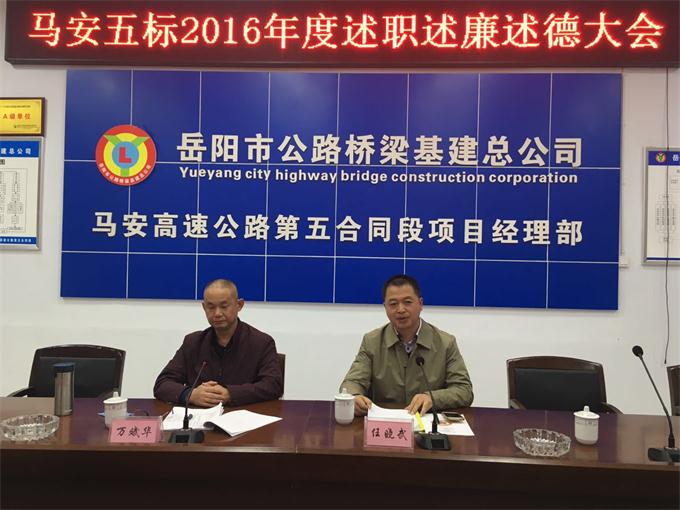 期间,任晓武来到各办公室,慰问项目员工,并与大家亲切交流。在项目部会议室,召开了马安五标2016年度述职述廉述德大会。会上,万斌华通报了项目部在制度落实、生产经营、形象进度、安全文明施工等方面情况。项目经理王观次带领项目骨干成员分别对自身思想作风、履职履责、廉洁从业情况进行了汇报,在客观反映成绩的同时查找出不足,制定了改进措施,并对下阶段工作进行了计划和安排。
