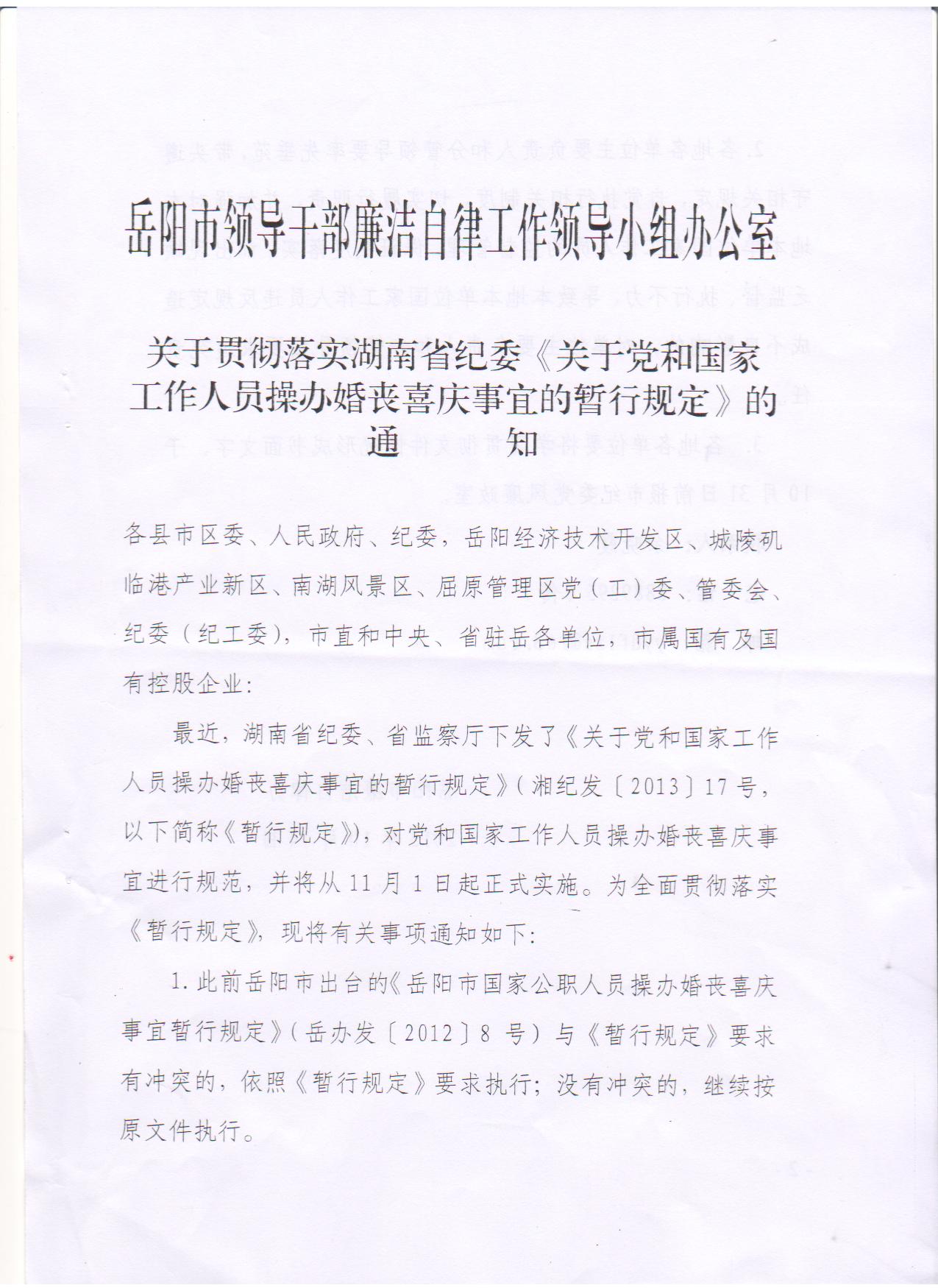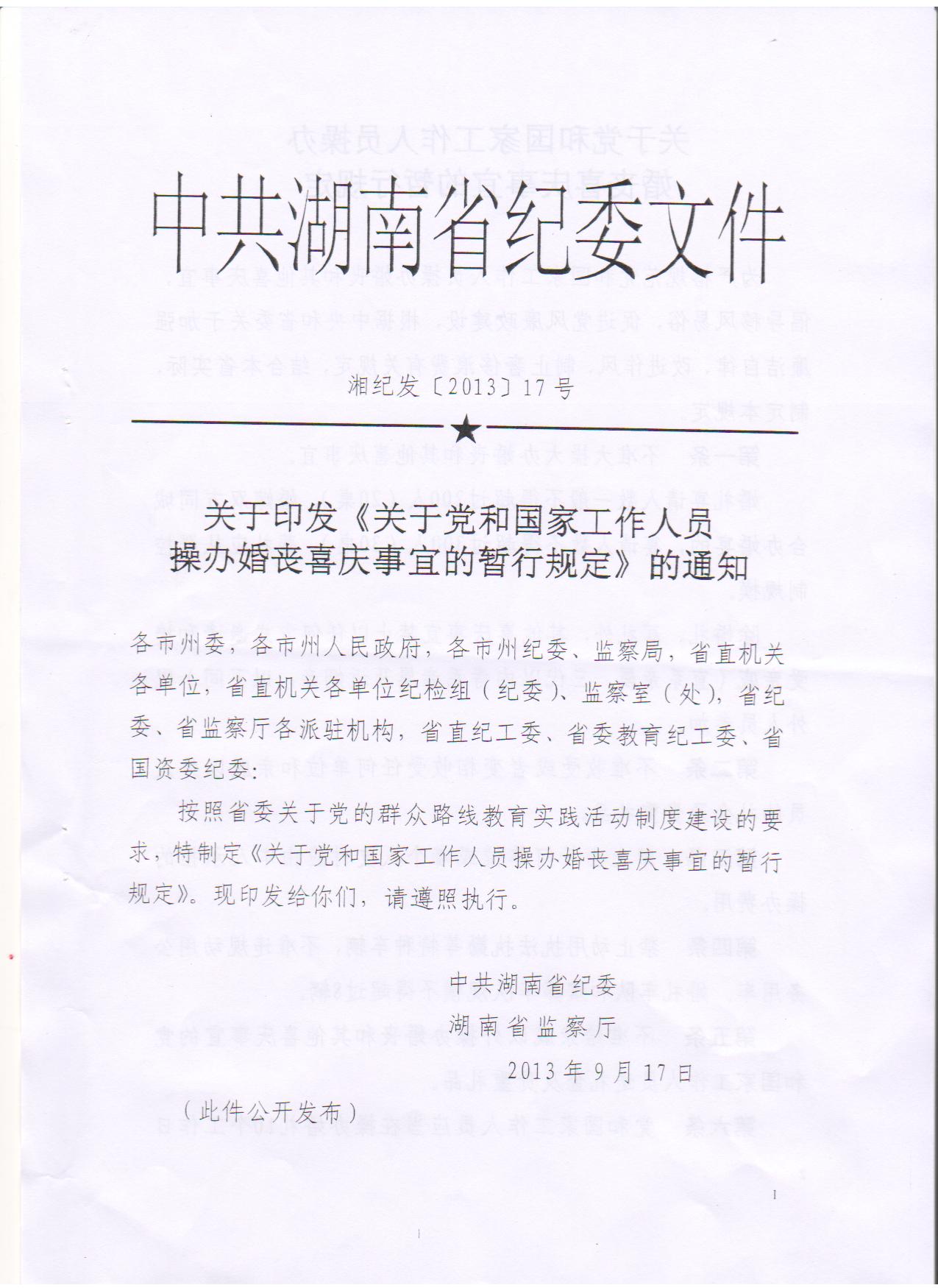 湖南省纪委关于印发《关于党和国家工作人员操办婚丧喜庆事宜的暂行规定》的通知