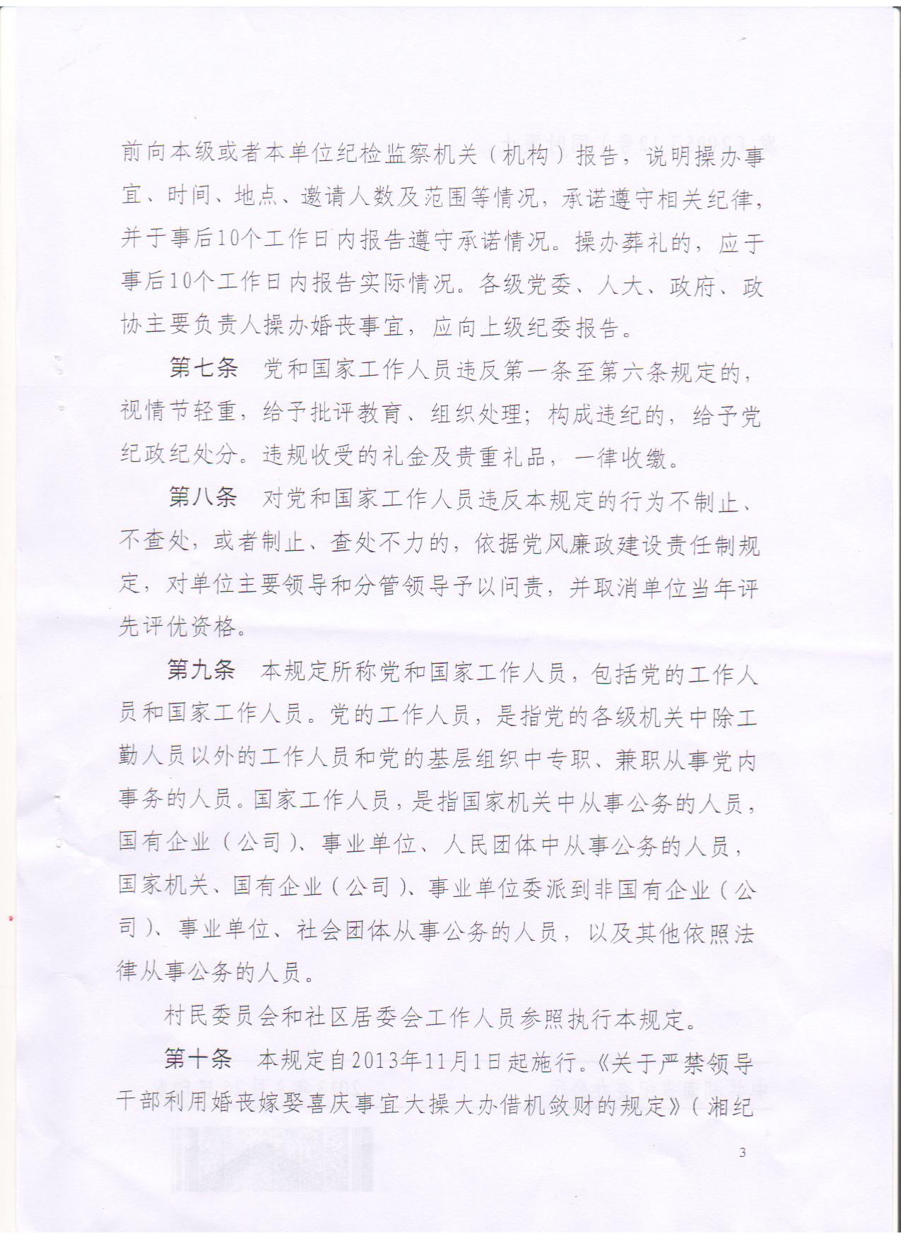 第十条 本规定自2013年11月1日起施行。《关于严禁领导干部利用婚丧嫁娶喜庆事宜大操大办借机敛财的规定》(湘纪发〔2005〕12号)同时废止。