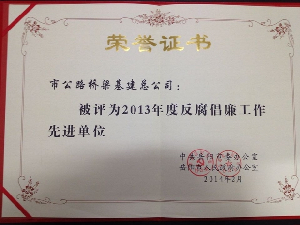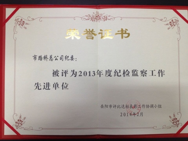2月20日上午,中共岳阳市第六届纪委第六次全会暨全市反腐败工作会议召开,公司党委书记毛响宝和副总经理、纪委书记胡德保出席了会议。岳阳路桥获得由市委市政府颁发的全市2013年度“反腐倡廉工作先进单位”荣誉,这是我公司自2011年来连续三年获此殊荣。公司纪委还获评全市2013年度纪检监察工作先进单位。