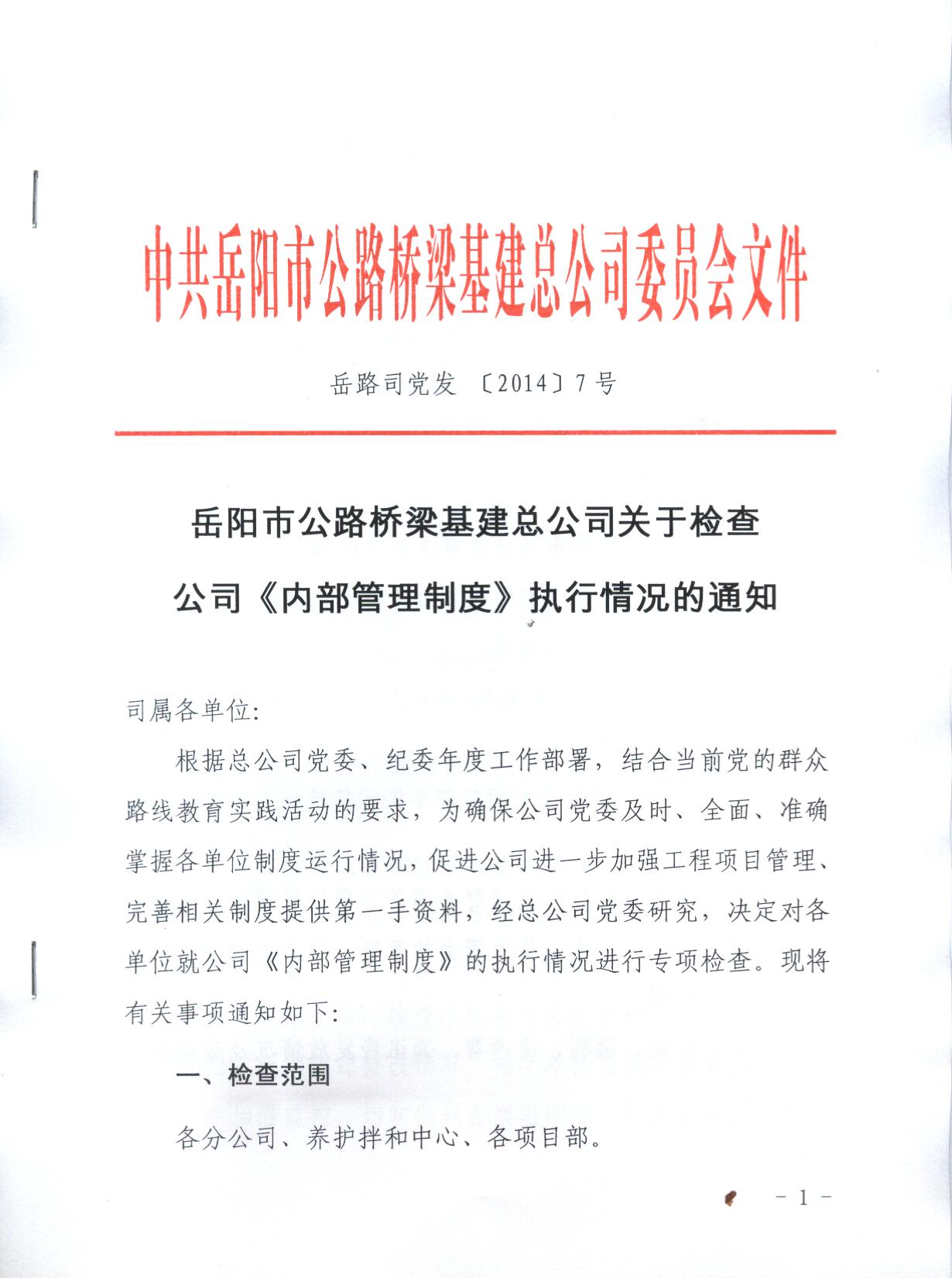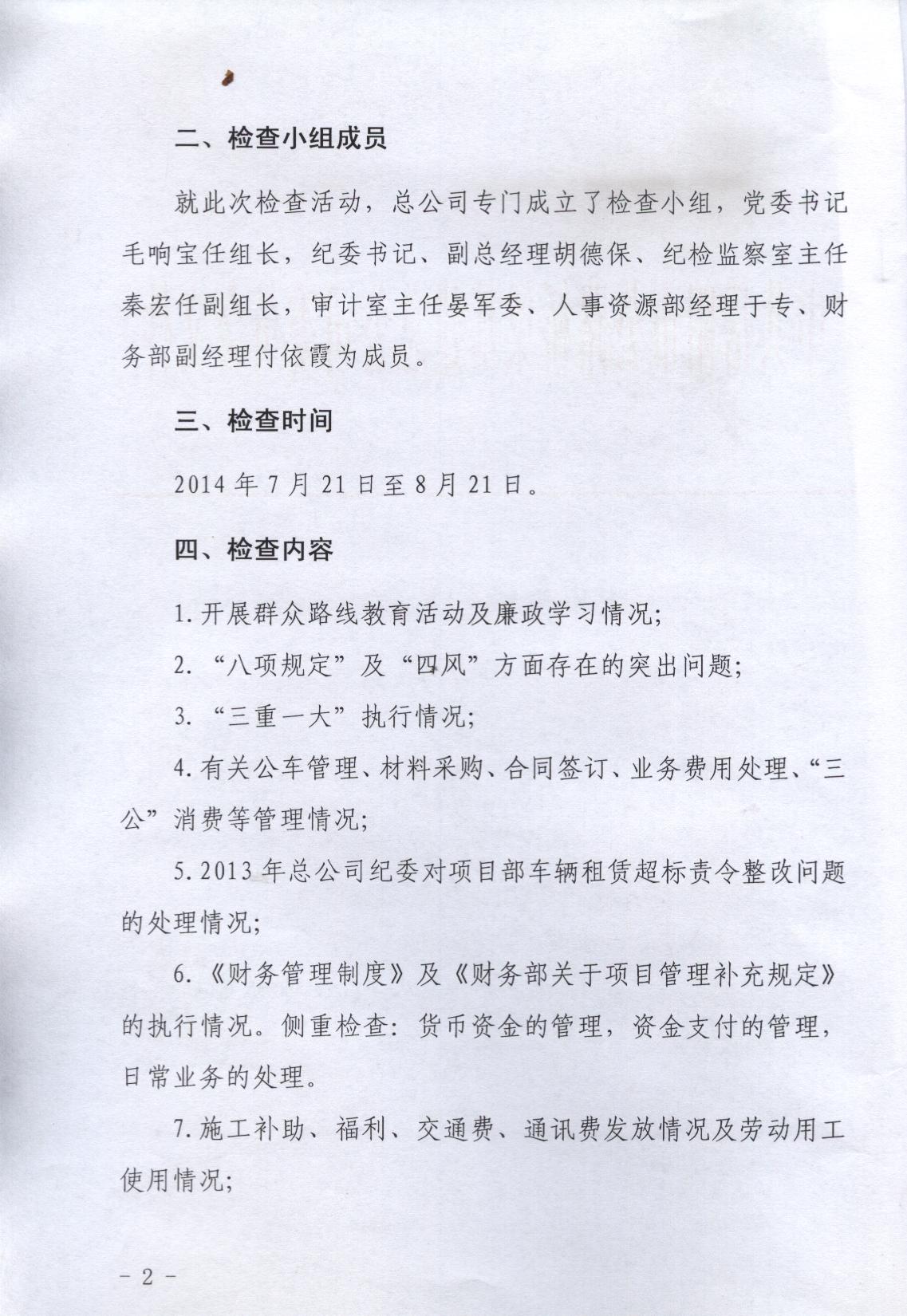 根据总公司党委、纪委年度工作部署,结合当前党的群众路线教育实践活动的要求,为确保公司党委及时、全面、准确掌握各单位制度运行情况,促进公司进一步加强工程项目管理、完善相关制度提供第一手资料,经总公司党委研究,决定从7月21日至8月21日对各分公司、项目部进行专项检查,重点检查公司《内部管理制度》的执行情况以及小金库自查情况。