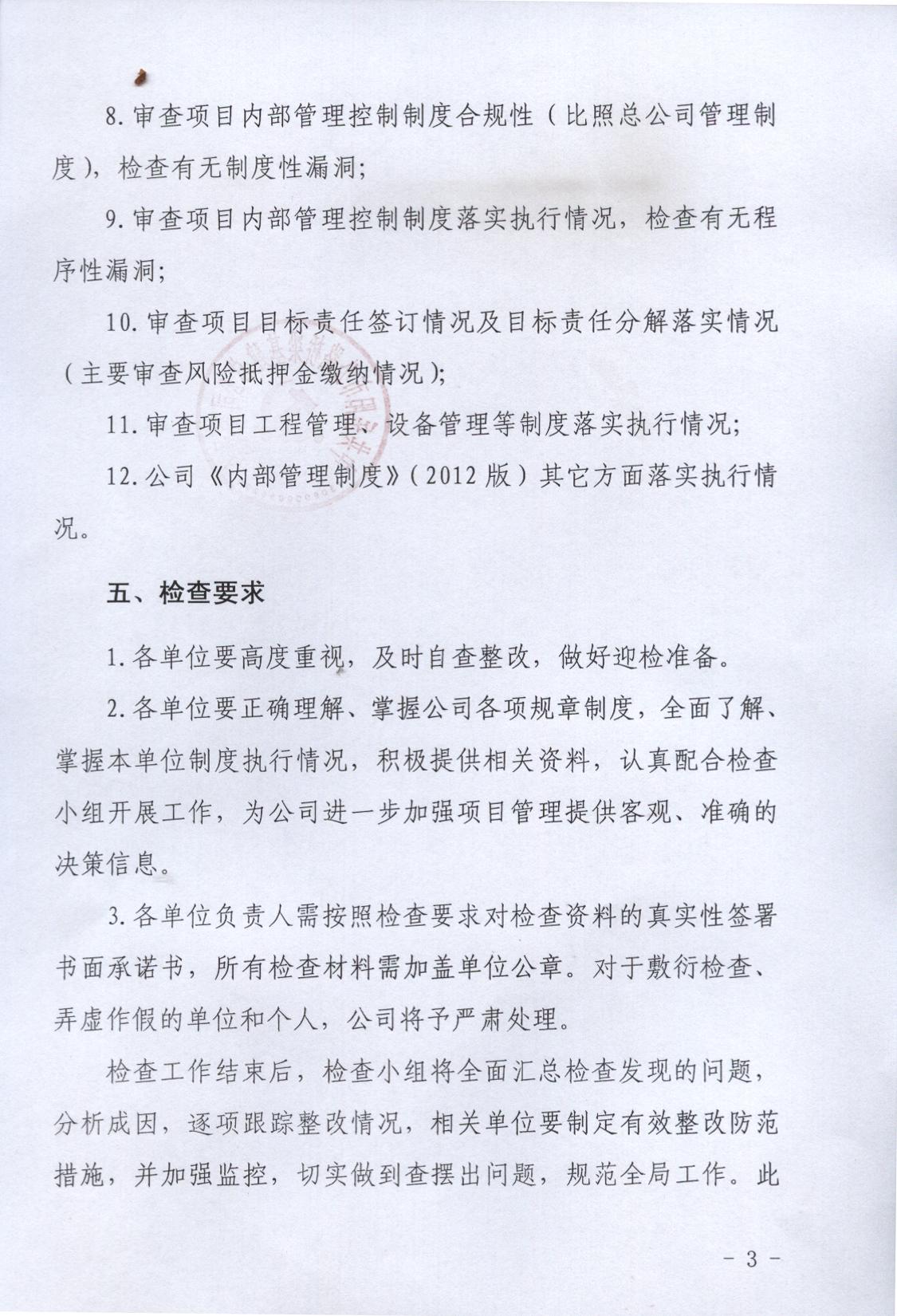 此次检查要求各单位对检查资料的真实性签署书面承诺书,所有检查材料需加盖单位公章。对于敷衍检查、弄虚作假的单位和个人,公司将予严肃处理。检查工作结束后,检查小组将全面汇总检查发现的问题,分析成因,逐项跟踪整改情况,并要求相关单位拿出有效整改防范措施,加强监控,切实做到查摆出问题,规范全局工作。此次检查结果将在全公司范围内进行通报,凡个人涉及违法违规问题的将按相关法律法规进行严肃查处。(曾海青)