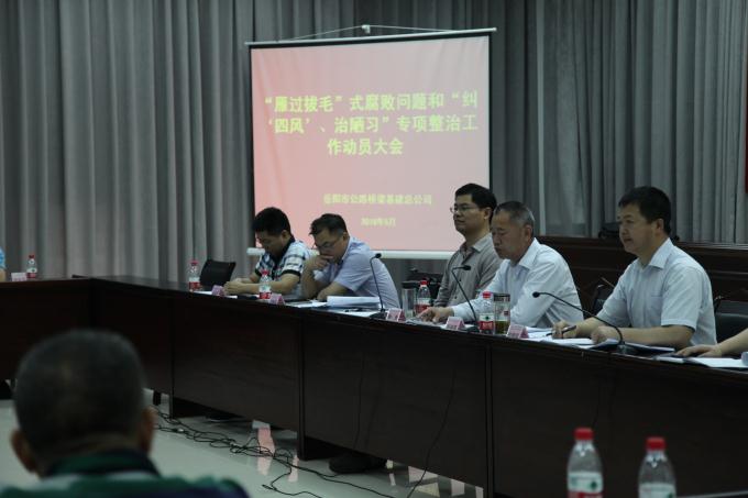 会议由总经理钟勇主持,会上,党委书记毛响宝同志传达学习了省、市、公路局专项整治会议精神,宣读了《岳阳市公路桥梁基建总公司 “雁过拔毛”式腐败问题和“纠‘四风’、治陋习”专项整治工作方案》,对专项整治工作进行了安排部署,成立了总公司“雁过拔毛”式腐败问题和“纠‘四风’、治陋习”专项整治领导小组,明确了各部门工作责任和工作重点。