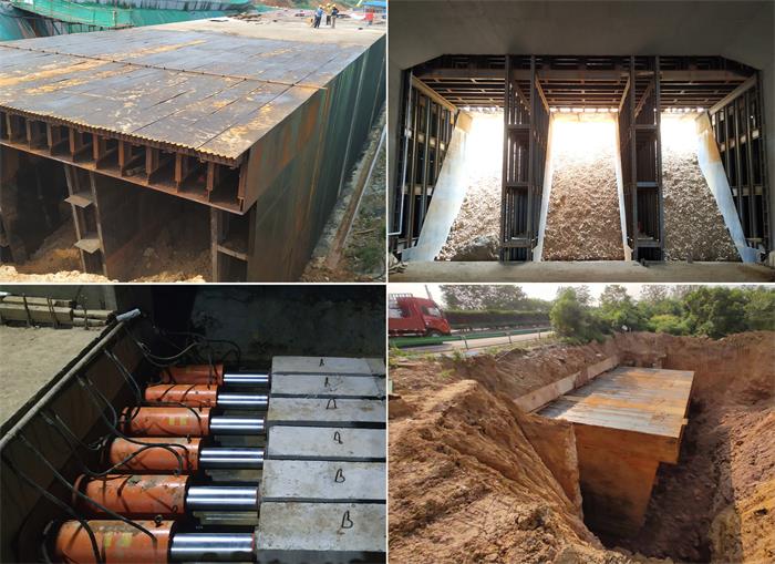 湖北G316鄂州市泽林至樊口段改建工程下穿武黄高速公路采用了箱涵顶推工艺,施工时,需在高速公路正常通行的情况下,利用36台200T千斤顶,将盾构机及自重达6097.4吨的箱涵,推进前行53米,最终下穿武黄高速公路。