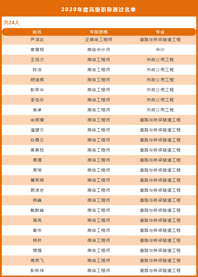 人才兴企战略下,岳阳路桥2020年度高级职称评审和一级建造师资格考试通过人数均创下公司历史新高,其中:24人通过高级职称评审,包括正高级工程师1人;11人取得一级建造师执业资格。