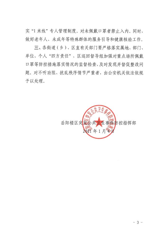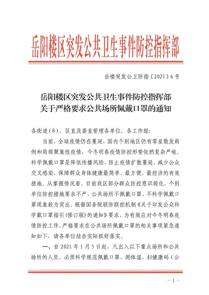 关于严格要求公共场所佩戴口罩的通知(岳楼突发公卫防指〔2021〕6号)