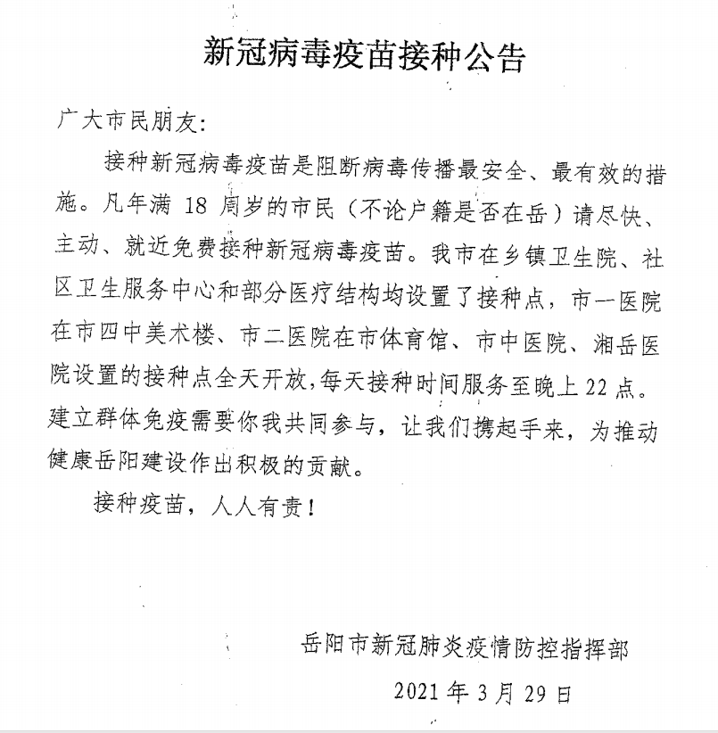 作者: 岳阳市新冠肺炎疫情防控指挥部 发布时间: 2021-04-01     点击量: