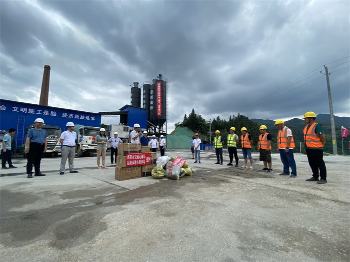 刘海波一行在项目部主要负责人陪同下,来到项目三义村隧道进行实地检查,在施工现场,刘海波详细了解项目建设规划、进展情况及面临的问题。在听取项目负责人的汇报后,刘海波对项目建设情况及施工人员抢抓工期的辛勤付出给予了充分肯定,勉励项目全员乘势而上,安全高效推进项目建设。随后,刘海波一行来到项目拌合场,为一线工人送去了防暑等慰问物资。
