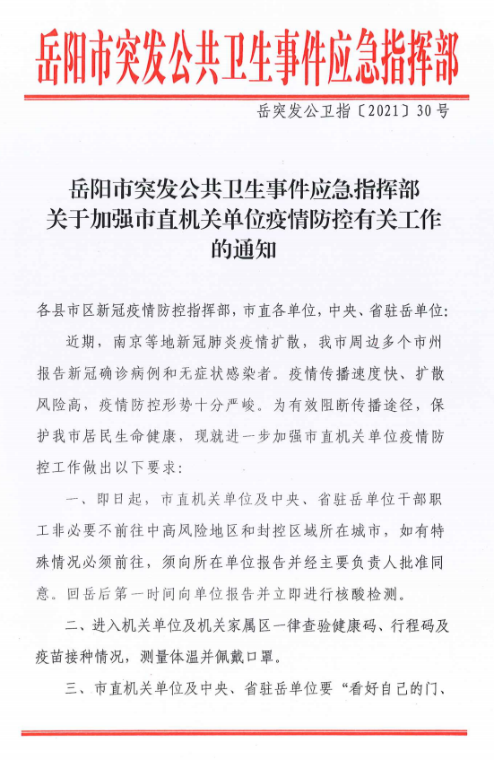 岳阳市疫情防控最新指令:机关单位疫情防控再升级!