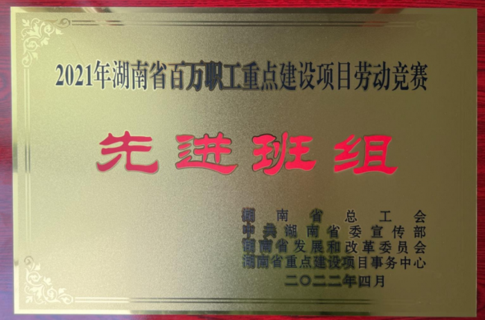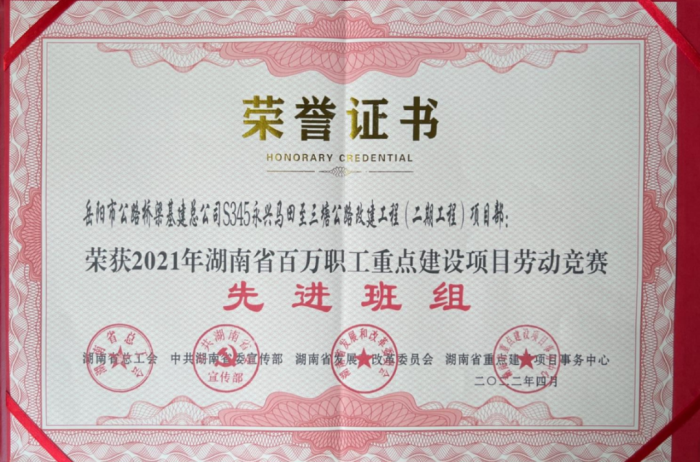 4月29日,湖南省庆祝“五一”国际劳动节暨先进集体先进个人表彰大会在长沙召开。岳阳市公路桥梁基建总公司S345永兴马田至三塘公路改建工程(二期工程)项目部获湖南省总工会、省委宣传部、省发改委、省重点建设项目事务中心四部门联合表彰,被授予“助力‘十四五’建设新高地”湖南省百万职工重点建设项目劳动竞赛先进班组荣誉称号!