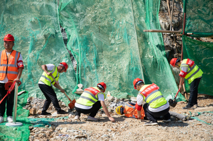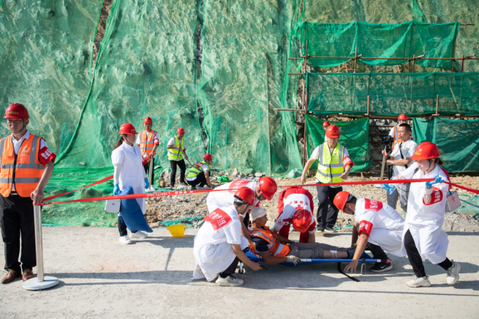 演练模拟一名边坡施工人员不慎从高处坠落,接到现场管理人员的求救信息,在项目经理的指挥下,项目部立即启动应急救援预案,紧张有序高效完成事故救援,对事故原因展开认真调查,留存第一手影像资料,准确完整出具初步事故调查报告。