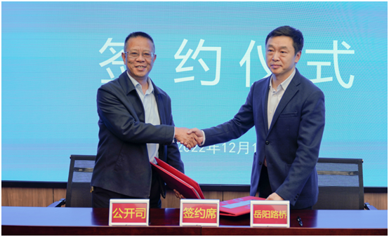 △ 贵州省公路开发公司党委书记、董事长袁泉,岳阳路桥集团党委书记、董事长黄河代表双方签约