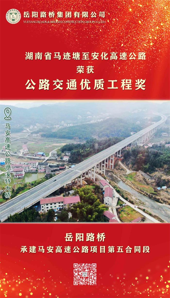 马安高速公路项目是岳阳路桥众多公路工程项目的一个缩影。多年来,岳阳路桥持续深耕公路施工板块,参建了一大批公路工程项目,先后荣获“中国土木工程詹天佑奖”、湖南省建设工程“芙蓉奖”、浙江省“钱江杯”优质工程奖、四川省“天府杯”优质工程奖、重庆市“巴渝杯”优质工程奖等一批省部级以上荣誉。未来,公司将始终坚守品质至上理念,不忘初心,载誉前行,努力筑就更多优质工程。