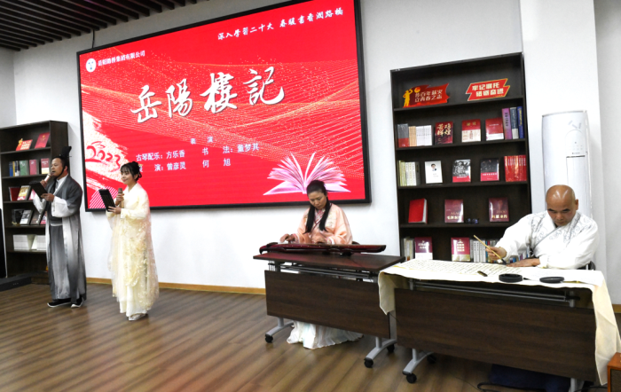 活动伊始,一台集书法、古琴演奏、诗文朗诵于一体的《岳阳楼记》综合节目拉开帷幕,吟诵了上下求索的忧乐情怀。特邀嘉宾、著名作家段华以自身阅读著文经历向大家分享了阅读的魅力。