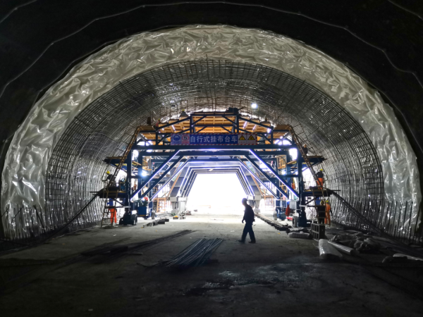 大岙坑隧道长2873.5米,上下行分离式,双向四车道,是项目关键控制性工程。开挖按新奥法原理组织施工,实施多臂凿岩机、拱架台车、湿喷机械手、自行式移动栈桥、二衬厚度预检台车、防水卷材作业台车、二衬台车、二衬养护台车和电缆沟槽台车“九台套”标准化作业。24小时远程实时智慧监控系统,进一步强化施工安全管控。