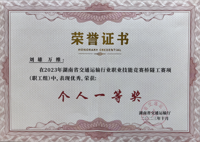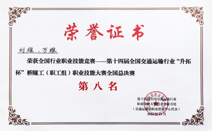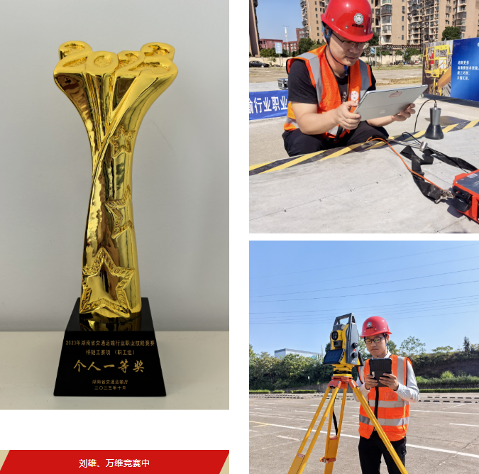 在今年十月份举办的第十四届全国交通运输行业桥隧工(职工组)职业技能大赛湖南赛区选拔赛中,刘雄、万维组合夺得“个人一等奖”,并作为湖南省队成员参加全国总决赛。赛前集训中,他们毫不松懈,反复摸索和实践,进一步提升理论素养和业务技能,为在总决赛中脱颖而出打下了坚实基础。