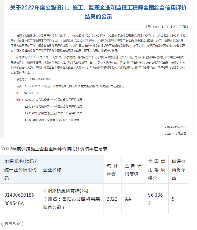 国家交通运输部近日发布了2022年度公路施工企业全国综合信用评价结果,岳阳路桥集团再度获得最高信用评价等级“AA”级,这也是公司自2020年以来连续三年获此殊荣。