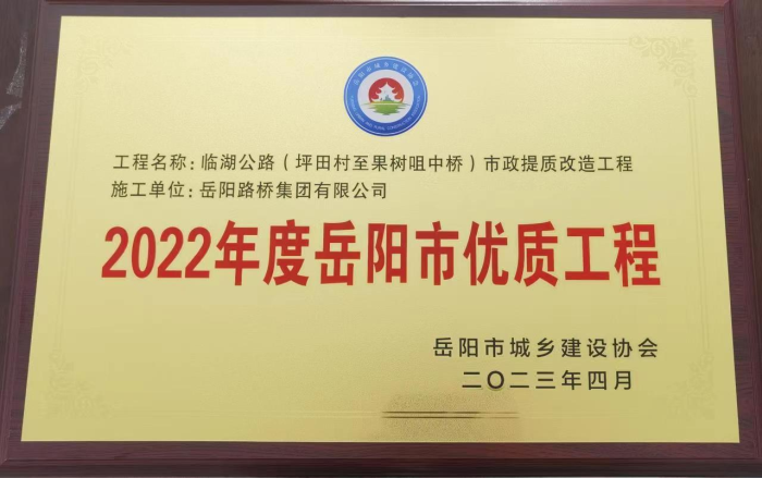 岳阳路桥集团获评岳阳市2022年度优秀建筑业企业、2022年度先进会员单位,公司承建的临湖公路(坪田村至果树咀中桥)市政提质改造工程和临湖公路(云溪段)沿线环境整治工程一期项目荣获岳阳市优质工程奖。公司职工曾霄和段立伟两位同志荣获岳阳市优秀项目经理荣誉称号。