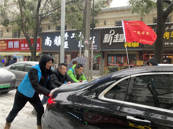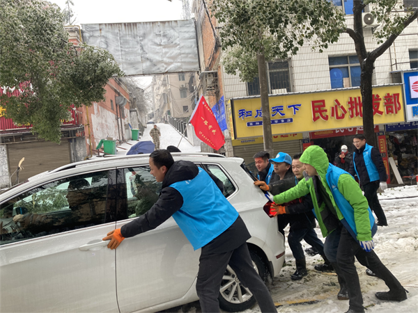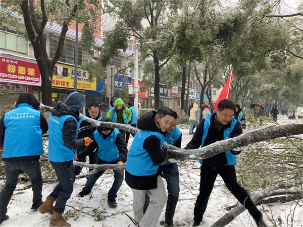 风雪中,鲜红党旗迎风飘扬,引领着岳阳路桥党员先锋队、青年志愿者和民兵队伍挺膺担当,在皑皑冰雪中绽放出“傲雪红梅”的芬芳。