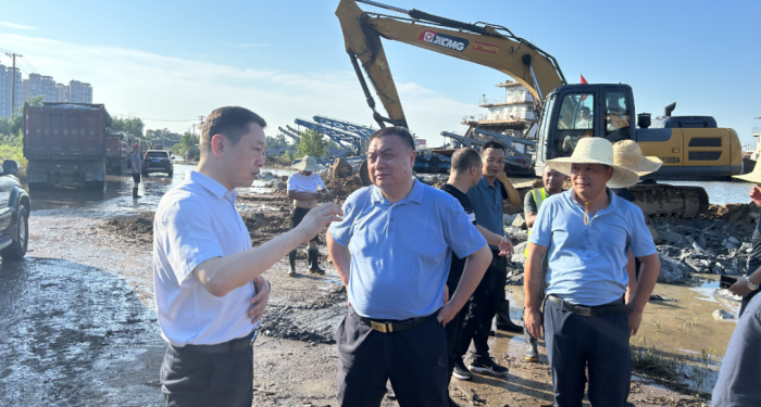集团党委书记、董事长黄河陪同市交通运输局党组书记、局长刘爱军在北门战备渡口临时码头作业现场调度指挥,集团三分公司书记王观次、经理罗安邦、副经理彭军华驻守现场并汇报有关情况。在新建成的临时码头,大家正在有序将块石、砂石等材料卸车装船,通过水路转运至合龙施工现场。
