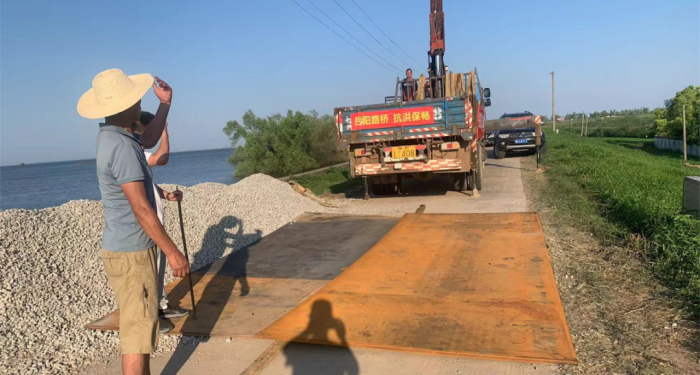 在钱粮湖镇苍芜台路段铺设加强钢板。