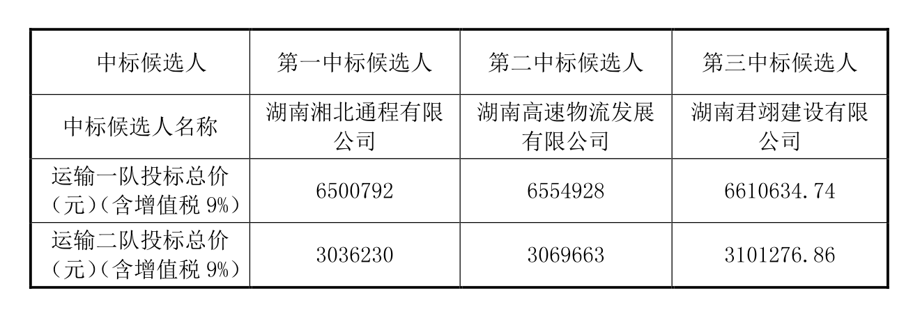 岳阳路桥集团有限公司湖南省桂新高速公路桂阳至新田(宁远)段总包部于2025年11月12日9:30(北京时间)在岳阳路桥集团有限公司对水稳混合料及改善层未筛分碎石运输劳务分包进行了公开开标、封闭评标;在集团公司成本管理部、三分公司班子代表、纪检监察部全过程监督下,评标委员会按照招标文件确定的评标办法进行了细致的评审,并推荐中标候选人排名如下: