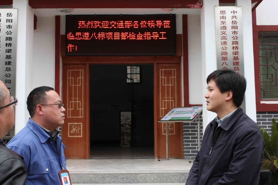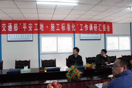 3月17日下午3 时许,交通部领导王恒斌、福建省高指陈荣刚在思遵高速公路总监办总监甘睿的陪同下莅临思遵八标岳阳路桥项目部,进行“平安工地·施工标准化” 工作调研。交通部领导王恒斌一行在思遵八标会议室观看了“平安工地·施工标准化示范标段创建”影像资料,并听取了常务副经理钱家军的平安工地施工标准化创建工作汇报。随后王恒斌处长对思遵八标投入大量资金进行平安工地施工标准化创建给予充分肯定,并希望创建单位正确认识“平安工地·施工标准化”创建工作,及时总结经验,将“平安工地·施工标准化创建”工作在思遵高速建设过程中持续开展下去。