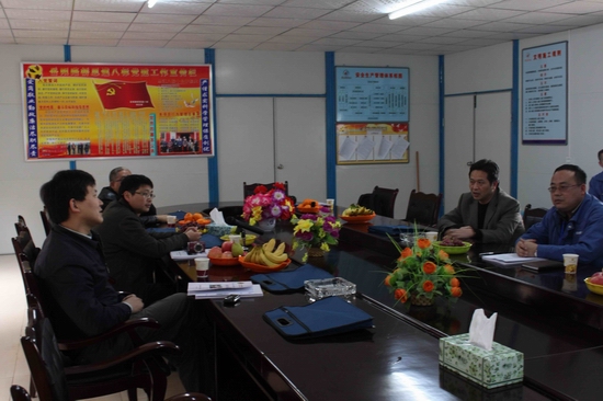 交通部领导王恒斌(左一)听取副经理钱家军(右一)工作汇报。