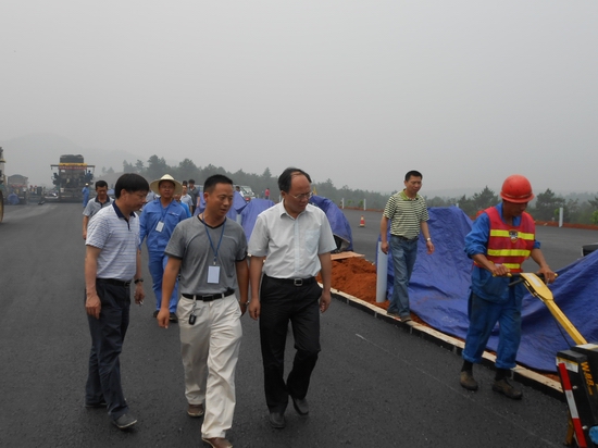 湖南省交通运输厅党组书记、厅长贺仁雨(右二)一行莅临我岳阳路桥桂武高速第三十一合同段冒着高温在项目经理吴建勇(左二)陪同下,现场察看路面施工情况。