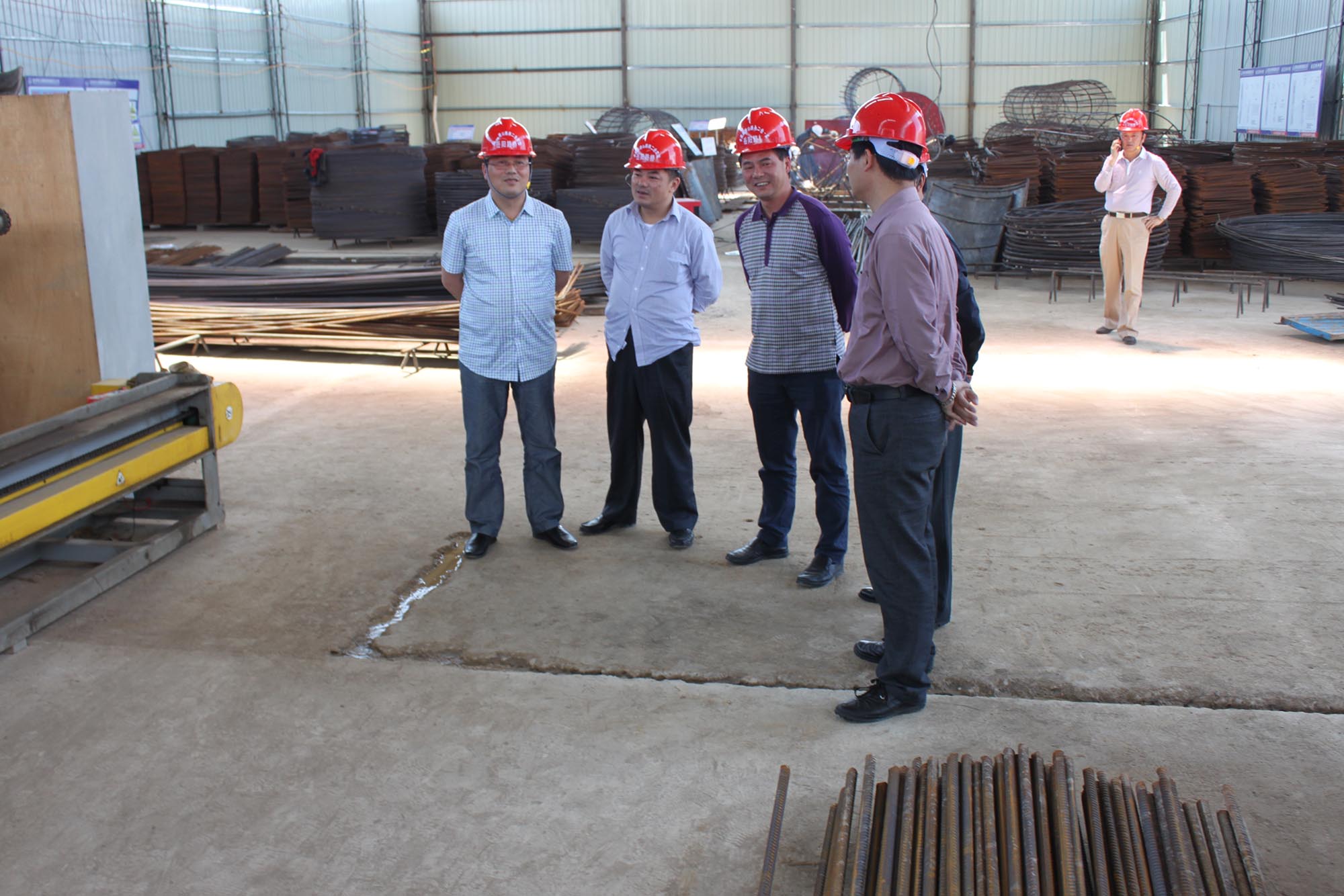 总经理陈鹏(左三)、纪检书记胡德保(左二)一行在钢筋加工车间视察