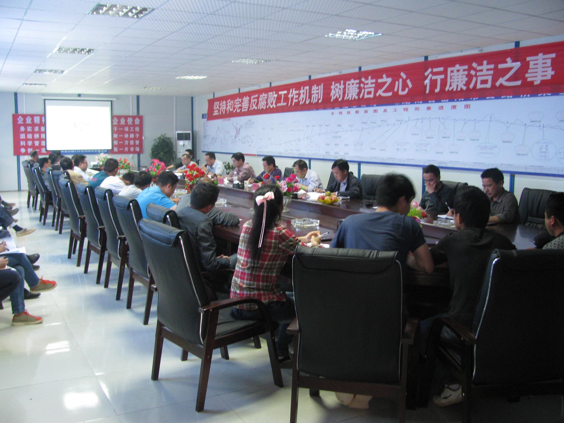 下午1时许,陈总经理与胡德保书记召集余凯二标主要负责人召开述职述廉大会。只见会议室正中墙面上方悬挂着:“坚持完善反腐败工作机制,树廉洁之心,做廉洁之事,行廉洁之事”的横幅标语。会上,陈总经理对余凯项目在短时间内迅速全面展开施工,给予了高度的评价,寄予了殷切期望:“余凯项目管理到位、材料采购阳光、透明;标准化建设规范、形象好!余凯项目是公司在贵州的第二个项目,希望余凯项目能够承前启后,继续创造双A级信誉等级,为公司进一步拓展贵州市场创造条件;同时希望余凯项目锻炼出几支技术过硬、业务精湛、精于管理的施工队伍,培养一批的技术型、管理型人才;希望项目进一步加大安全生产管理力度,以点带面,重点突出、抓好控制性工程,严把安全生产关、工程质量关,力争创造丰厚的经济效益、社会效益!”会议接着由纪委书记胡德保从国家管理角度、公司管理角度、项目管理角度三个方面详细阐述了述职述廉的重要意义。胡书记要求:“余凯二标项目部领导班子要廉洁自律,严格要求自己,充分发挥职工监督作用,在搞好生产,完成目标任务的同时,加强廉政建设教育,做到生产与廉政建设两不误。营造讲廉守廉、风清气正的浓厚氛围,确保各项制度的可行性和实效性,切实把党风廉政建设责任落到实处。”随后项目部主要人员作了述职述廉汇告,每个人均签订了《廉洁自律承诺书》,公开接受测评。 (董梦其、戴文佳供稿)
