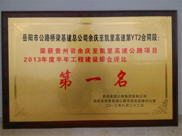 继贵州思遵八标项目推行“平安工地•施工标准化”取得突破以来,余凯二标项目精益求精,将标准化建设的接力棒传递到了一个新的起点。8月22日,在贵州省余庆至凯里高速公路项目2013年度半年工程建设综合评比中,余凯二标在全线18个标段中夺得第一名,被评为“建设标兵”。