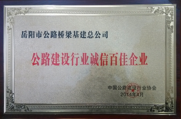 日前,中国公路建设协会“诚信百佳企业”表彰大会在京举行,岳阳市公路桥梁基建总公司榜上有名,被评为2011—2012年度公路建设行业诚信百佳企业,成为岳阳地区唯一一家上榜企业。