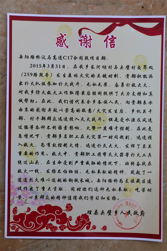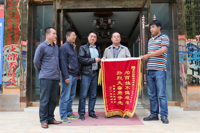 6月17日下午,里县夹壁乡镇政府党委书记吴红亮带队,率领乡党委班子一起来到汶马C17标项目部,送来感谢信一封、锦旗一面,以感谢我项目部在3月31日协助夹壁乡政府扑灭森林大火。