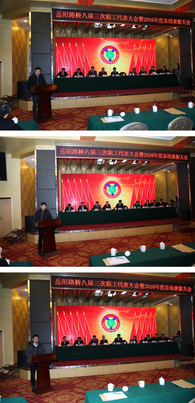 2月8日上午,岳阳路桥八届三次职工代表大会暨2016年度总结表彰会顺利召开。会议回顾总结了过去一年的工作,分析研判公司当前面临的机遇与挑战,明确了2017年的总体目标和具体工作安排。市公路局党委书记、局长冯嘉皇、总工程师徐军以及相关部门负责人出席了会议。会议由公司党委书记毛响宝主持。