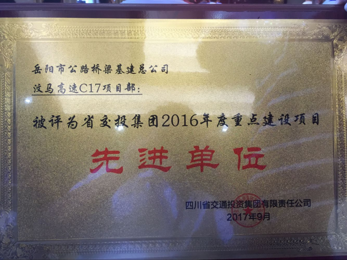 9月5日,四川省交通投资建设有限公司召开“省交投集团2017年重点项目建设管理工作年会”,会上对2016年度重点建设项目的先进单位进行了表彰,汶马C17标作为汶川至马尔康高速公路上唯一的施工单位荣获 “省交投集团2016年度重点建设项目先进单位”荣誉称号。