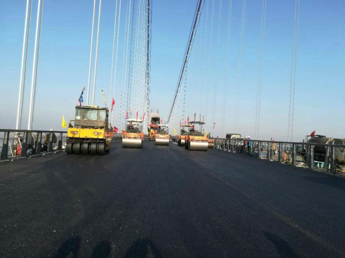 11月26日,大岳高速洞庭湖大桥正式开始桥面沥青摊铺,一天内完成了半辐主桥摊铺。