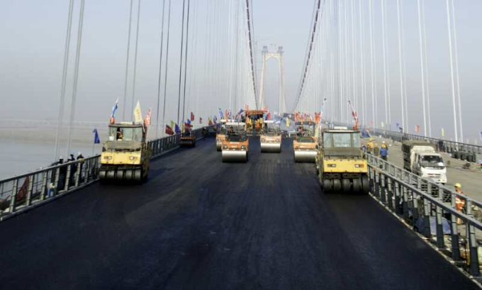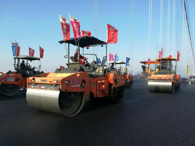 大岳高速洞庭湖大桥位于湖南省岳阳市七里山,全长2390米,东起岳阳,西接君山,跨越湘江河道,河道两岸均为湘江Ⅰ级阶地,是一座主跨1480米两跨不对称钢桁梁悬索桥,是目前世界第二、国内第一大跨径钢桁加劲梁悬索桥。其中桥面摊铺工程由岳阳路桥承建。