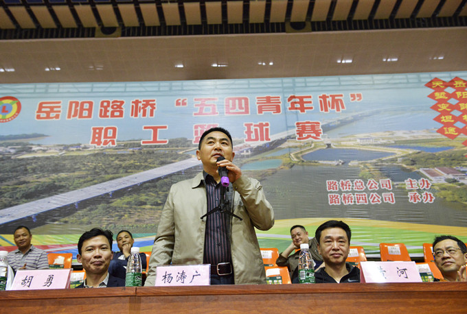 黄河在致辞中指出,此次职工篮球赛,是岳阳路桥高度重视企业文化、重视体育活动的一次盛会,是职工精神面貌的一次集中展现。他希望,各参赛队伍要发扬“友谊第一、比赛第二”的精神,赛出风格、赛出水平,增进友谊、增进感情;裁判员要公平公正,为各位球员提供良好的展示舞台。四公司经理佘岳军致欢迎辞,表示要努力把本次比赛办成一个文明、精彩、充满正能量的盛会。
