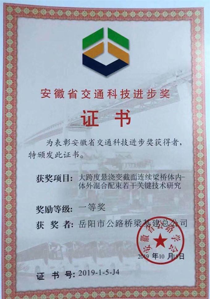 日前,安徽省交通科技进步奖获奖项目揭晓,岳阳路桥作为主要完成单位的“大跨度悬浇变截面连续梁桥体内-体外混合配束若干关键技术研究”科研项目荣获一等奖。