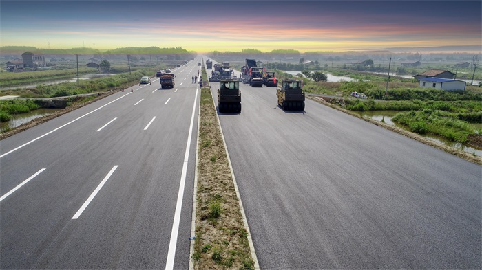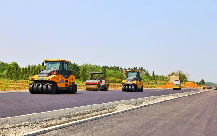 抢抓进度,采取双摊铺机并排摊铺,50台成品料运输车辆不间断供料,2台摊铺机并排摊铺,2台光轮压路机、3台胶轮压路机不间断地呈梯队式来回碾压,机械轰鸣,响彻长空。