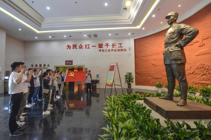 “我志愿加入中国共产党,拥护党的纲领,遵守党的章程……”纪念馆大厅,何长工同志雕像前,鲜红的党旗下,全体党员同志在机关支部书记袁雪翔同志的带领下,高举右拳,庄严宣誓,重温入党誓词。铮铮誓言,铿锵承诺,表达的是对党的忠诚,为共产主义事业奋斗终生的决心,饱含着担当作为、实干兴司的强烈愿景。